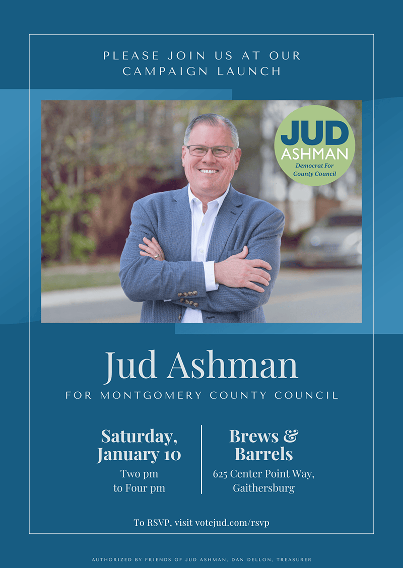 You are invited to the official launch event of Jud Ashman’s campaign for Montgomery County Council, District 3. This event is free and open to all, but donations are welcome!